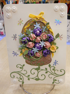 The last card I made in this release was made using dies DL214 Spring Basket 1, DL214A Small Spring Basket Angel Wing, B175 Mini Fanciful Flourish, B180 Princess Tree used on the inside of the card. I also used a Magnolia stamp colored with prisma color pencils and gamisol liquid. I hand punched the silver dragonflies with a paper shaper hand held punch. The verse used on the inside of the card was a Magnolia verse stamp. The die is a spellbinder die which can be special ordered from Dutch Paper Crafts. All my flowers are hand made. All of the cards were very easy to cut using my Big Shot. All of the card stock used was from my stash.